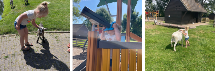 Daar aangekomen zijn we natuurlijk even bij de geitjes in de wei geweest. Elk geitje moest geaaid en geborsteld worden. Het viel me eigenlijk op dat het zo rustig was qua dieren op de kinderboerderij. Later besefte ik me pas dat heel veel dieren binnen moeten blijven vanwege de vogelgriep. Dat was natuurlijk wel jammer, want het is juist zo leuk als er eendjes en kippen lekker rondscharrelen.