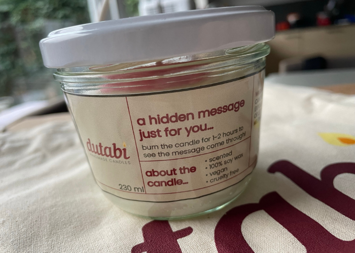 Heerlijk hè, dat het weer vroeg donker is? Voor mij het teken om de kaarsjes weer aan te steken en de open haard op te stoken. Super leuk dus dat ik van Zeena van Dutabi een van haar kaarsen met een verborgen boodschap toegestuurd kreeg. Terwijl ik deze blog schrijf, staat de kaars naast me en ik kan niet wachten om je te laten zien welke leuke boodschap erin staat!