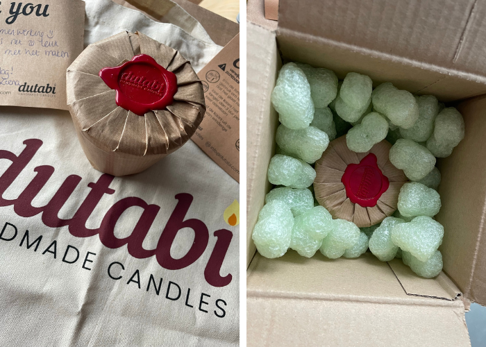 De basis van de kaars is een 100% soja was. Soja was staat erom bekend dat het zo’n 30-40% langer brandt dan een reguliere paraffinekaars en het geeft ook 90% minder roetvorming. Dat is dus een stuk beter voor je gezondheid. Naast deze biologische afbreekbare was doet Dutabi veel moeite om zoveel mogelijk duurzaam verpakkingsmateriaal te gebruiken. De glazen potten zijn herbruikbaar, de kraaltjes van de verborgen boodschap kunnen aan een touwtje worden geregen als ketting, armband of sleutelhanger en zelfs de vulchips in de verzenddoos zijn 100& biologisch afbreekbaar en kunnen gewoon bij het GFT-afval.