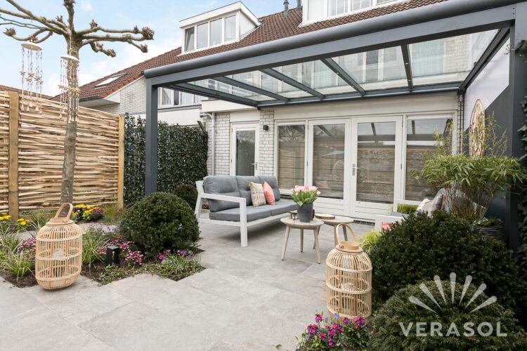 Nu zag ik laatst op Instagram iemand die zo’n prachtige aluminium terrasoverkapping had laten plaatsen maar er dus ook een glazen schuifdeur in had laten zetten. Dat zorgt ervoor dat je dus echt helemaal uit de wind zou kunnen zitten. Of zelfs in de winter gebruik kan maken van je buitenruimte. Zo’n tuinkamer is natuurlijk niet hetzelfde als een (geïsoleerde) serre, maar het is in ieder geval warmer dan een open overkapping. Ik zie mezelf al zitten hoor, met mijn dekentje, een boek en een kop thee in het winterzonnetje!