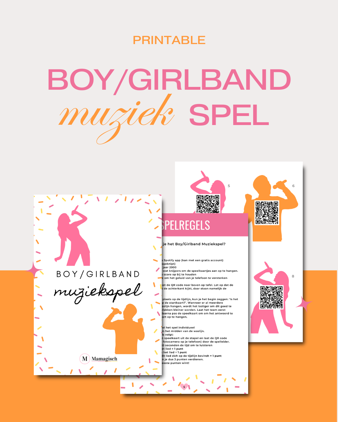 Het Boy/Girlband Muziekspel is een spel waarin je aan de hand van het scannen van QR codes op de speelkaarten, de titels, artiesten en jaar van uitgave van 24 liedjes omtrent het thema ‘Boybands en Girlbands’ gaat raden. Met liedjes uit de jaren ’90 en ’00’s, duik je gelijk weer helemaal terug je jeugd in! De lyrics en danspasjes komen gelijk weer terug uit het gedeelte van je brein waarvan je niet wist dat het nog bestond! Je kunt dit spel als individu spelen of in team.