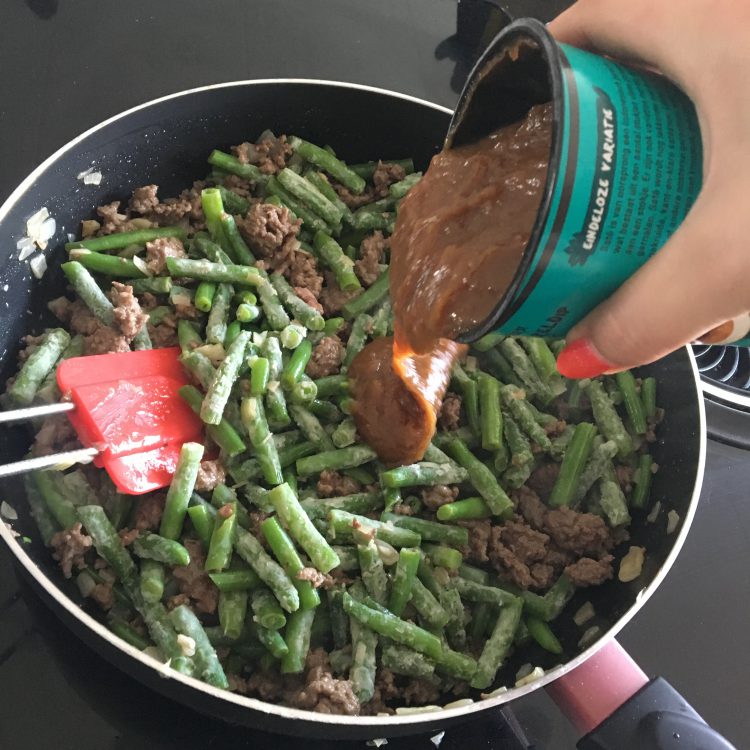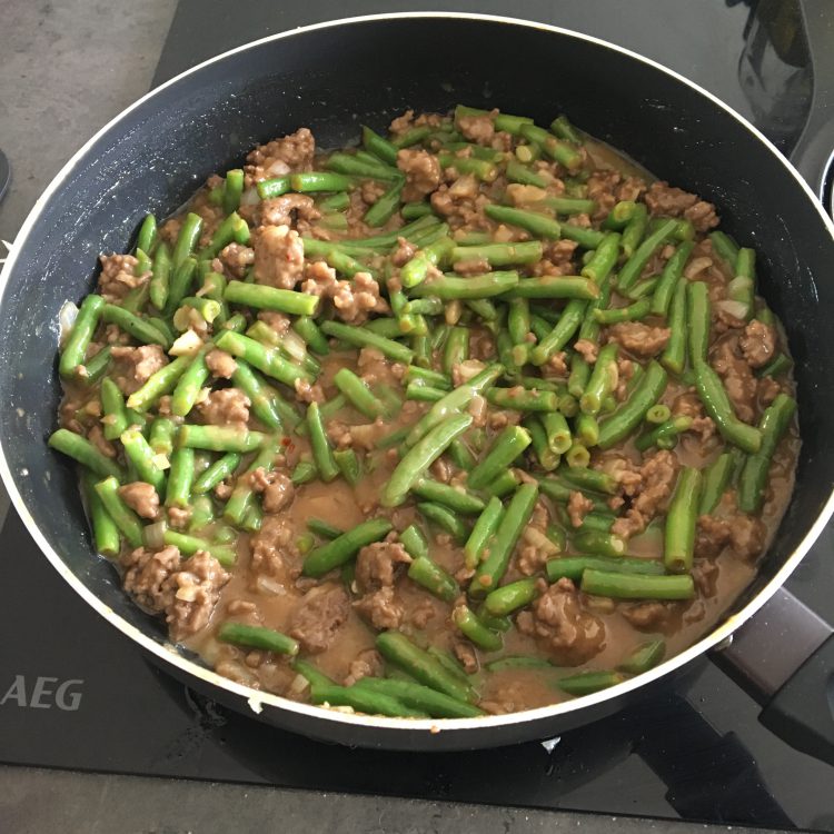 Zet een hapjespan op het vuur en verwarm daarin een beetje olijfolie of boter. Snijd de uitjes en de knoflook fijn en bak dit even kort in de hapjespan. Voeg de gehakt toe en bak deze rul. Voeg hier de sperzieboontjes en de satésaus aan toe en roer het een goed om. Laat het nog minimaal een minuut of 5 doorsudderen. Ik doe zelf het deksel er op, zodat de boontjes die niet helemaal onder de saus liggen, gaar gestoomd worden. Roer regelmatig even om. Heb je het idee dat de saus erg dik is, voeg dan een klein beetje water toe en roer goed om.