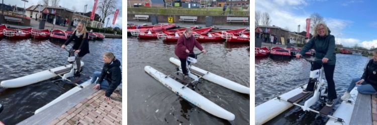 Met ons fluisterbootje vaarden we door de dorpsgracht richting de locatie van Aquaverhuur waar we een ritje konden maken op wel hele bijzondere waterfietsen. Ik dacht bij dat woord eerder aan zo’n zwaan waar je naast elkaar de benen uit je lijf moet trappen om vooruit te komen maar de waterfietsen bij Aquaverhuur zijn een stuk moderner. De catamaran-achtige constructie is voorzien van een soort spinningfiets. Je kunt de waterfietsen per uur huren en daarmee per fiets te water de omgeving verkennen. Het fietsen zelf is alleen geschikt voor volwassenen maar met een speciale plank die op de catamaran bevestigd kan worden, kunnen kinderen (of de niet zo sportieve reisgenoten) als passagier meevaren. Al met al een hele bijzondere manier om de omgeving te ontdekken.