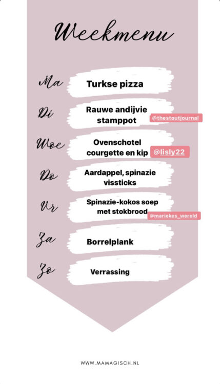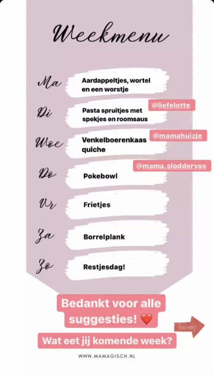 Ik ben de eerste die het toegeeft: ik ben gewoon lui. Of moe. Of moeder. Kies maar. Anyhow, om mezelf zo min mogelijk te laten verleiden om toch een maaltijd te bestellen, ben ik weer begonnen met het maken van een weekmenu. En als stok achter de deur gebruik ik mijn volgers op Instagram. Ik vraag wekelijks lekkere menusuggesties, waarvan ik er minimaal 3 per week inplan. Op deze manier val ik ook niet steeds terug op mijn vaste nummertjes en komt er ook weer eens iets anders op tafel. Gelukkig doen ze daar hier thuis niet moeilijk over. Ik kook een nieuw recept, we eten het en geven daarna onze eerlijke mening: mag ‘ie blijven of hoeft het niet nog een keer.
